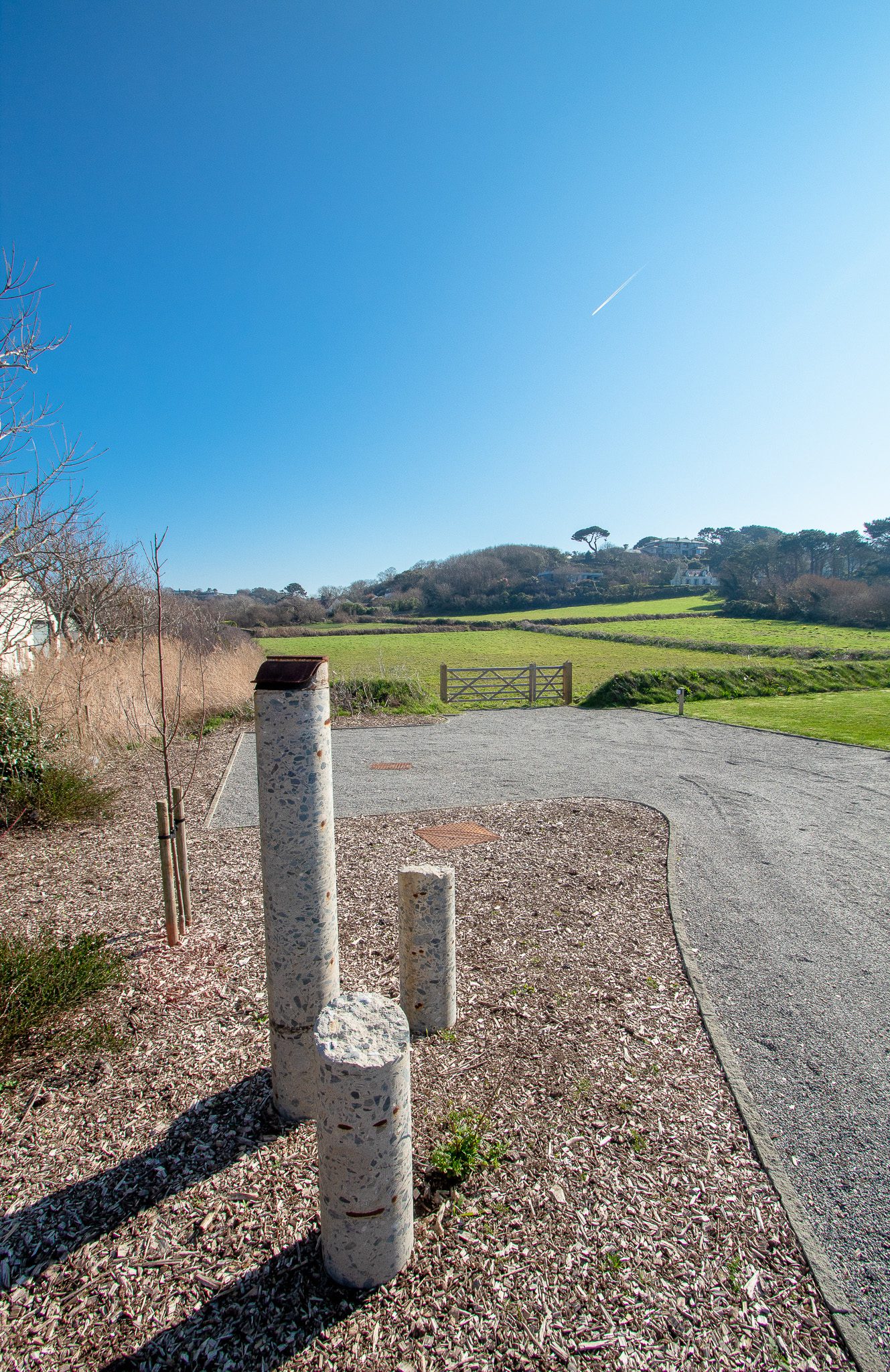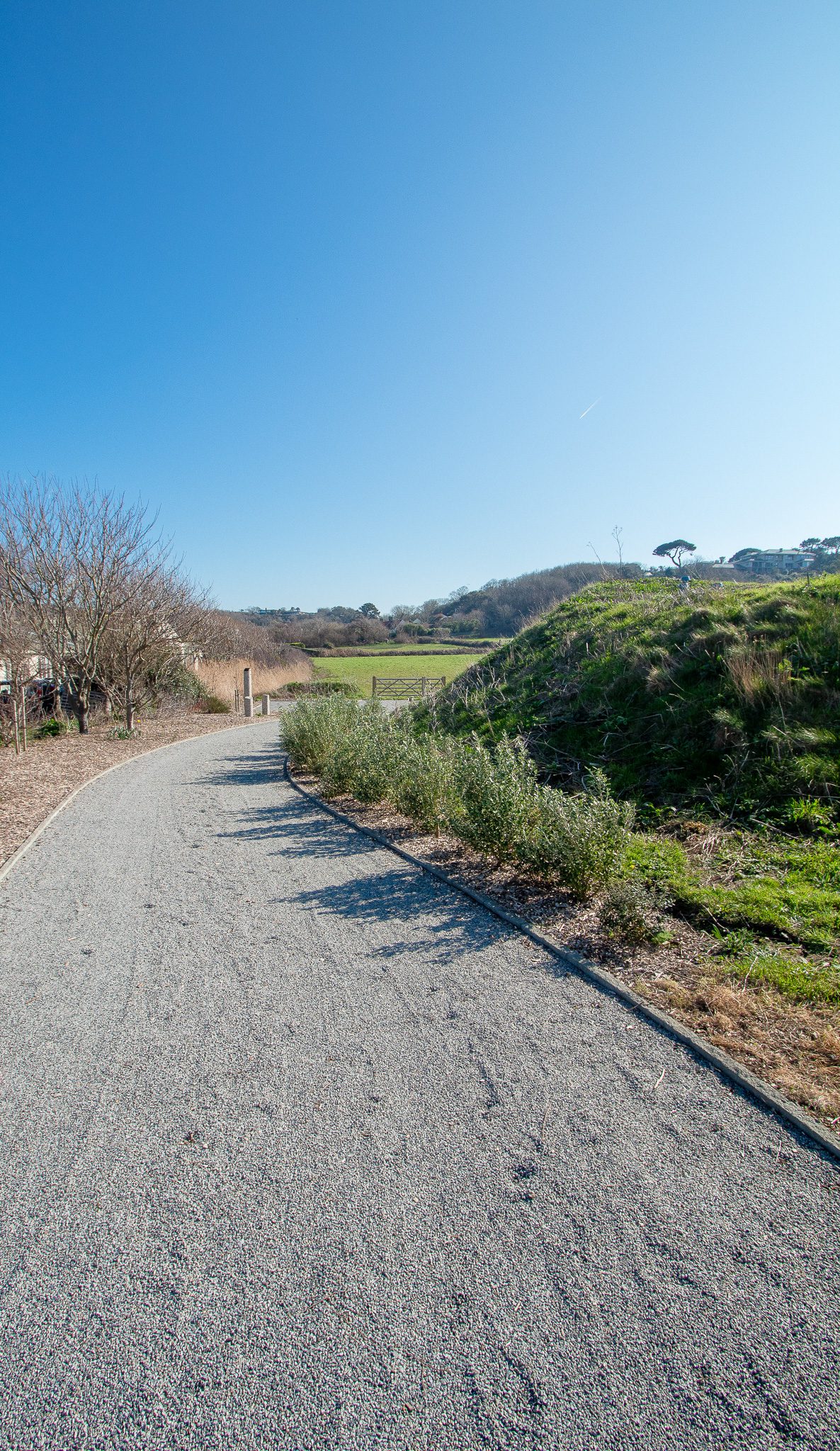 A sweeping gravel driveway leads to a large parking area and a first glimpse of the transformation.